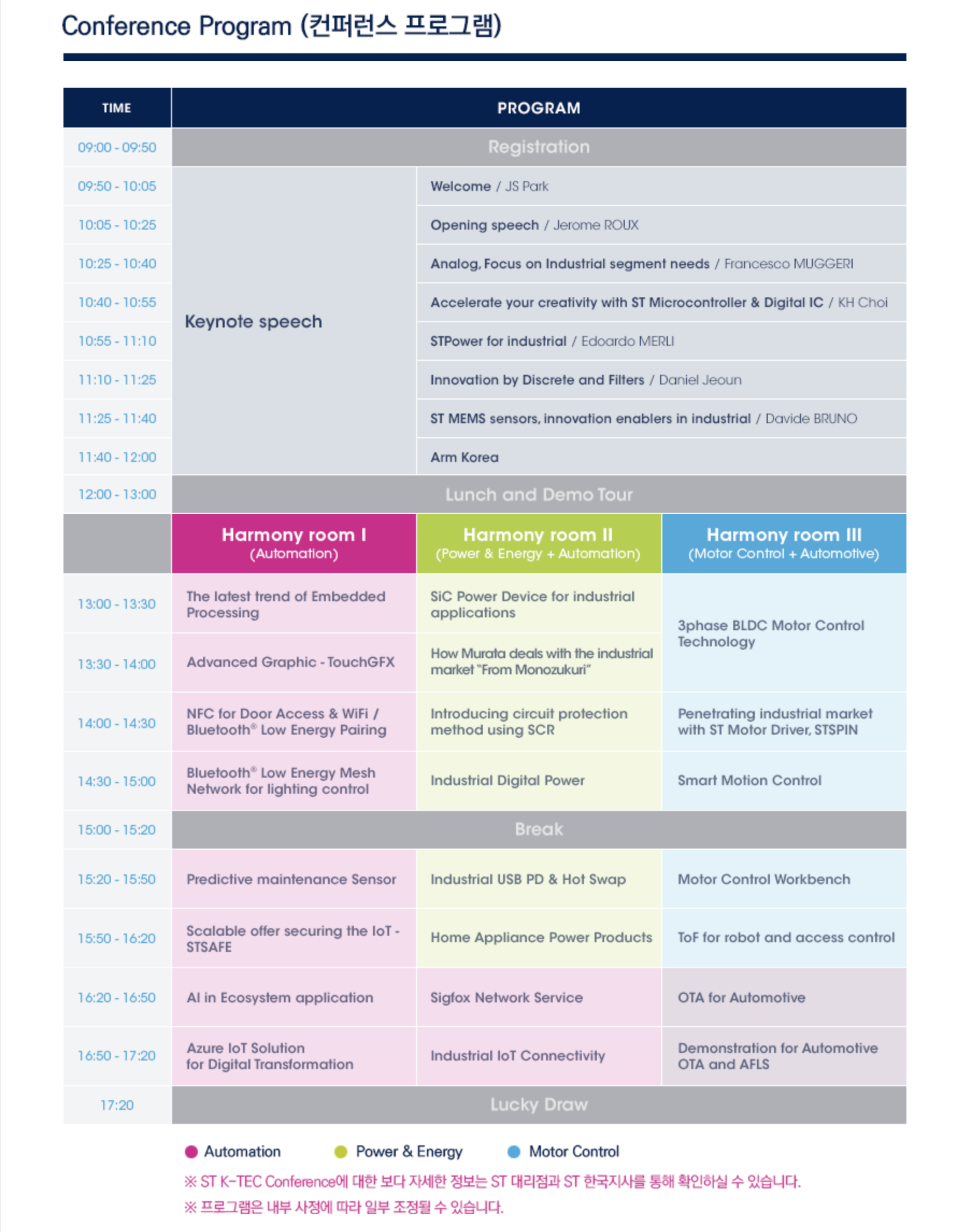2019.12.10. 화요일. STMicroelectronics 에서 주관하는 컨퍼런스에 참석했습니다. ST 한국 대리점인 레인콤텍 도움으로 등록을 할 수 있어 다녀왔는데, 기술기반 회사의 대규모 컨퍼런스에 몇 번 참석해봤지만 이번이 가장 알찬 내용이었다고 느껴집니다.
