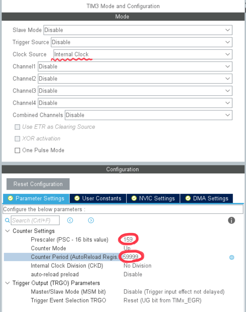 우리가 원하는 update frequency는 10Hz (100ms마다 한번) 이므로 ARR = 59999, Prescaler = 159 로 설정한다.
