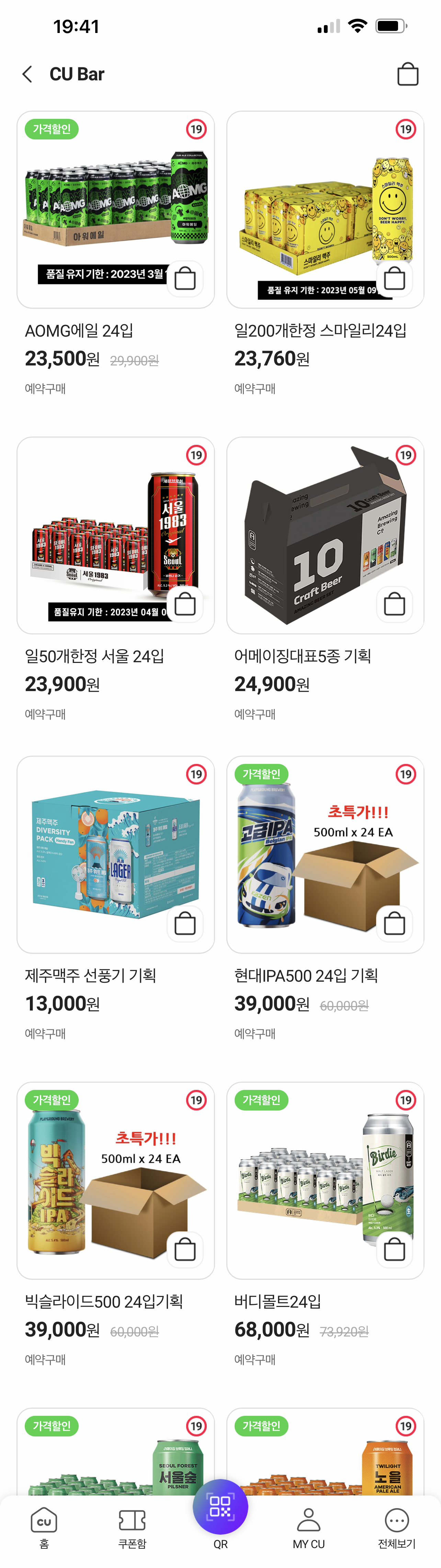 자, 자신의 스마트폰에 '포켓CU' 앱을 설치하고 가입을 한 후 주류 구입을 위한 성인인증까지 마치자. 홈 화면 맨 위 메뉴에서 'CU Bar'를 선택, 다음 화면에서 주류 종류 중 '맥주'를 선택하면 스마트오더로 구입할 수 있는 맥주 리스트가 나온다. 그중 특가로 나온 제품들을 보자.