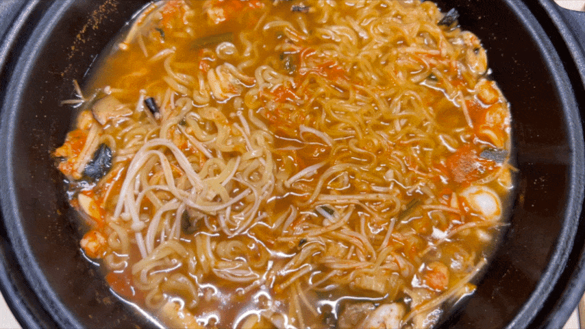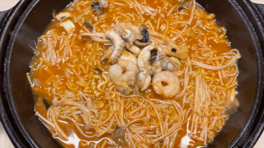 귀찮은 걸 싫어하시는 분은, 이렇게 챙겨 먹을 바엔 중국집에서 시켜 먹지,라고 생각하실 수 있으나, 이 모든 준비물을 냉장고에서 꺼내 냄비에 넣기까지 2분이면 된다. 생 라면을 끓일 때와 비교해 2분만 추가하면 된다는 이야기다. 장점은 해물을 마음껏 양껏 넣을 수 있다는 것, 땡고추 가루를 넣어 매운 정도를 조절할 수 있다는 것이겠다.