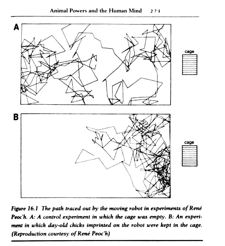 그는 또 다른 비교 실험도 진행했다. 로봇과 조건화된 병아리뿐만 아니라, 자연 상태에서 어미 닭과 함께 자란 병아리들도 실험했다. 이 경우, 병아리들은 로봇에 관심을 보이지 않았고, 로봇은 무작위로 움직였다. 즉, 로봇의 이동 패턴이 바뀌는 것은 병아리와의 조건화 때문이라는 것이다.